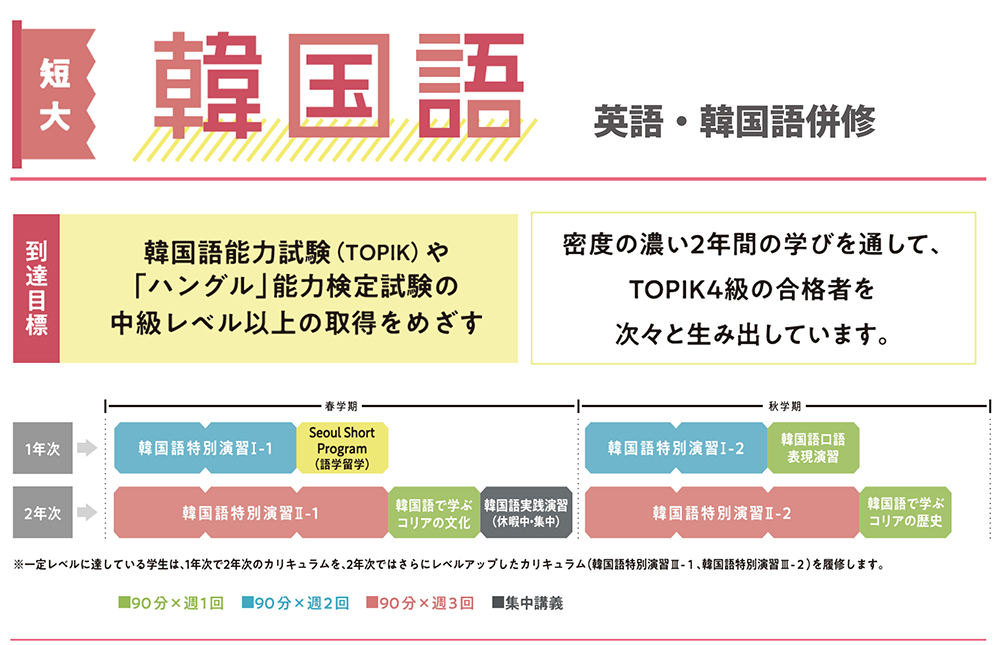 短期大学の「English+1 韓国語」は、密度の濃い2年間の実践学習を通して、英語+韓国語が本格的に併修できる本学ならではの学び。